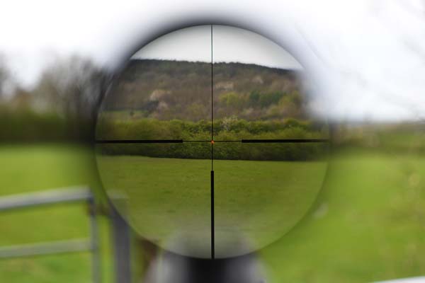 The parallax dial sits on the left-hand side and runs from 10m to infinity. There doesn’t appear to be any backlash and the image is crisp, even when at 12x magnification and at close range. This is unlikely to be needed with a centrefire, especially on full mag. The illumination control on the end offers 10 intensity stages for the second focal plane reticle’s centre red dot, which is undoubtedly my preferred choice on a hunting scope. Combined with a wide field of view and uncluttered reticle, you can accurately position the dot exactly where desired, and with intensity control, adapt it for the ambient light conditions without distraction.