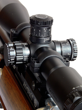 So now to the scope itself: it certainly looks the business, with its 30mm tube, three chunky turrets and distinctive saw-tooth knurling on the control surfaces. The entire scope has a tough-looking, matte-black finish, and all the lettering is pressed or moulded into the metal with none of the ostentatious gold or silver highlighting beloved of other brands. In fact, the only details that are picked out in white are the essential gradations on the controls, and these are duly crisp and clear.