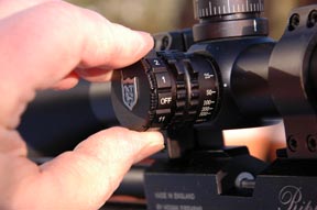The drum is pre marked 10, 25, 50 and 100yds upwards; however for FT work, it’s preferable to fit the sidewheel extender, which is a simple task. A choice exists between a big 100mm or super, eye-grabbing 150mm version. My test model came with the former, which replicates the range markings, save for an additional line for 15yds. Irrelevant really, as FT shooters will add their own in any case.