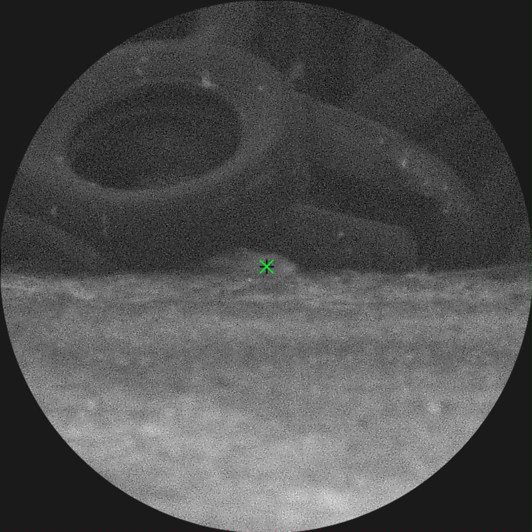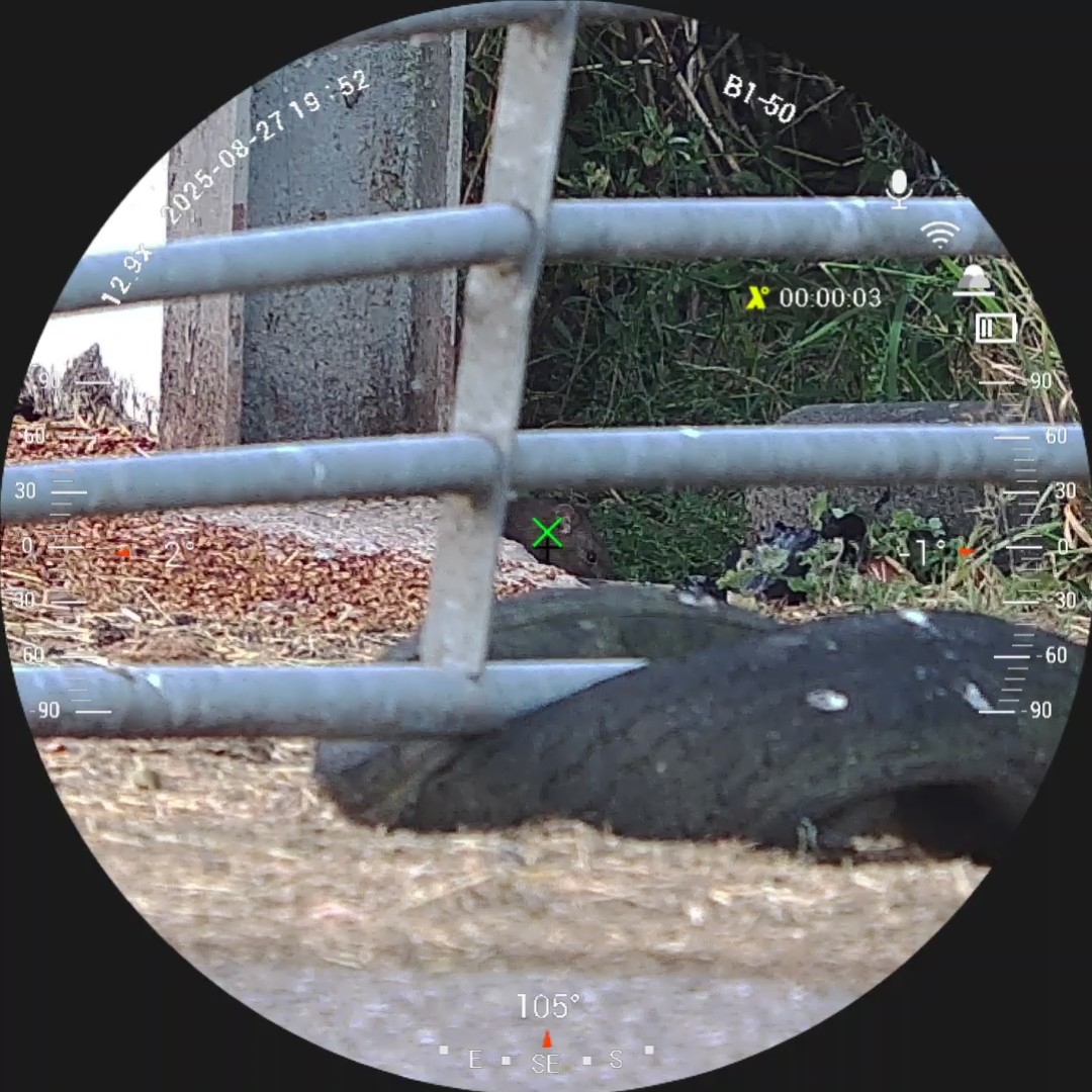 Having ranged this rat, the Volans has positioned the green secondary aiming point a fraction above the black reticle, ensuring a precise strike.