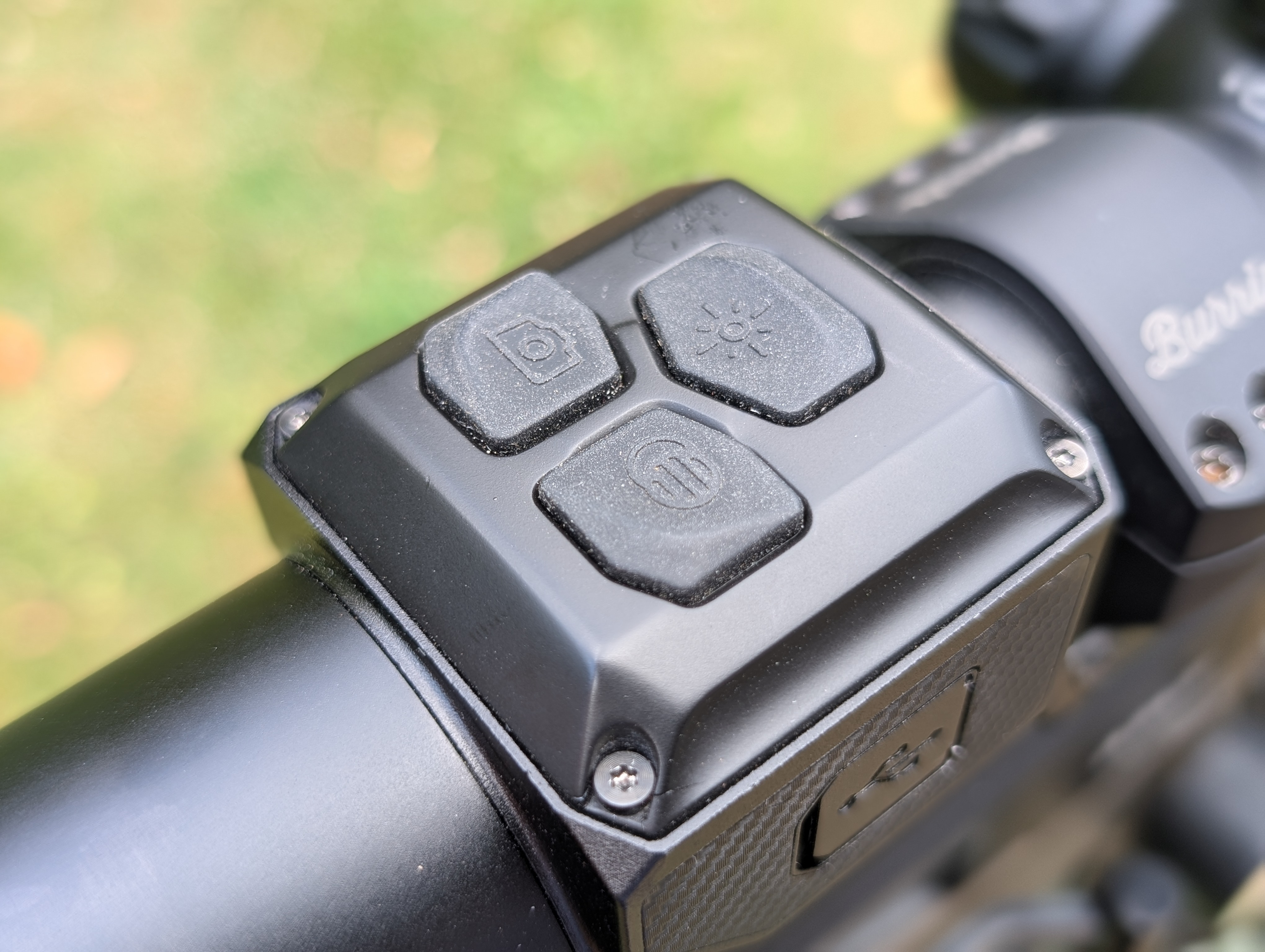 Our next set of controls is on the ocular bell and covers all the things you want to access quickly in the field. Three rubberised buttons enable rangefinding/PiP, still/video capture, and scene mode (colour for daylight use, and black-and-white, green, or sepia for use in low light and under IR). They are easy to locate, differentiate, and remember.
