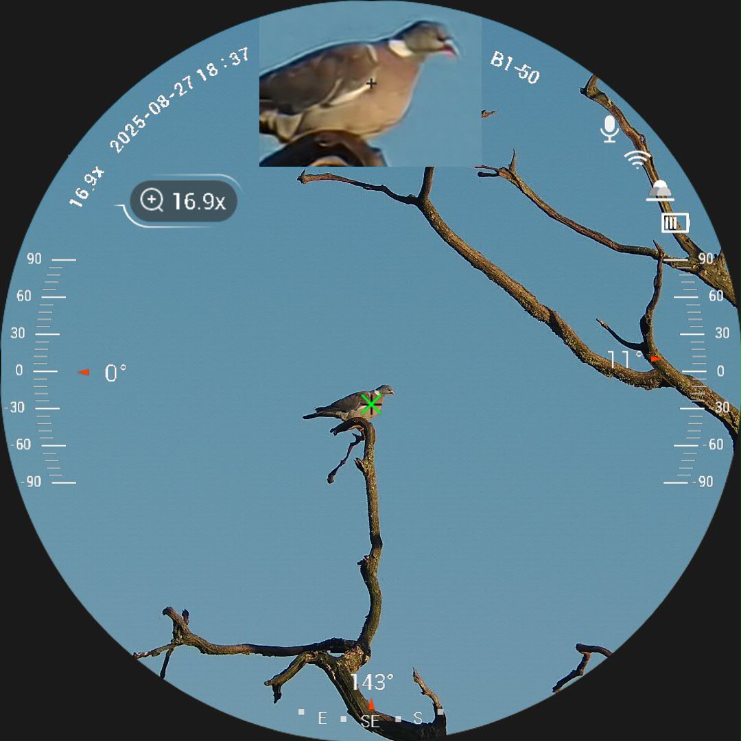 On top of the saddle is a familiar turn-and-click knob. Just turn it to zoom in or out. Base magnification is 4.3x, but it feels higher, perhaps due to a tight-ish field of view of 8.6m @ 100m. I’m very “less-is-more” about magnification, but for those who love it, the Volans will take you digitally all the way to 39x, while applying sophisticated AI to smooth out the pixelation as you go.