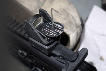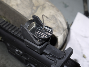 Different is the fact that the sight has no ON/OFF switch, so as soon as the battery is inserted into the base it’s on, but with a two year+ (working) run time that’s not an issue. Its small size means some compromises on controls. To change the battery you have to remove the sight from its base (two screws). There are no turrets; instead tiny Allen-headed screws do the job. This then means an Allen key with a slide-on plate (Minidial) so you can see which direction and how much correction you are laying in.