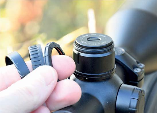 The clicks are tactile, producing a small perceptible noise and are comfortable to operate wearing gloves. Windage is a conventional finger dial underneath a cap, with similar 1cm clicks. It can be lifted and turned silently to mark L-R zero without tools.