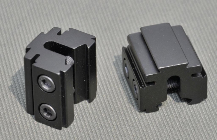 If so, you must remove the transverse locking screw and carefully spread them a little to widen the aperture, so that you can slide them on. Once the risers are all fixed in place, this, the latest design, has the added feature of further dovetail rails on each side, which could be handy for gun mounted accessories, such as a torch or laser. All very neat and highly effective.