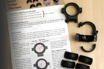 Moreover, because the offset system is based on ring-shaped inserts, the offset can be set at any angle. Thus, if the point-of-impact (POI) is at 45 degrees from the point-of-aim (POA) the offset inserts can be tilted by the same amount, the angle being easily measured on the rings by using the joints between the upper and lower halves of the rings and the inserts as datum points.