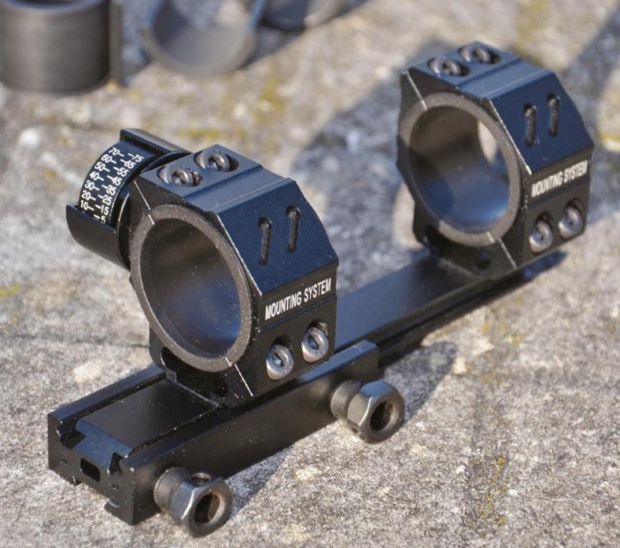 The type of mount used on an airgun is important, and one-piece types are best when fitting a scope to spring-powered models. The spring and piston bottoming out in the compression cylinder, produce a unique recoil effect that can cause some two-piece mounts to move, possibly affecting the zero and accuracy. A one-piece provides better contact and significantly more grip, to combat this. The Discovery One-Piece Universal Mount is well up to the task. It has a total length of 5”, weighs 6oz and a 2.75” base. It can accommodate body tube diameters of 25.4mm, 30mm and 34mm, making it versatile. The ring diameters are altered using plastic, space inserts (supplied). These sit in the rings and lock into place once the optic is in position. The split ring clamps lock together at a diagonal, and the centre of the rings are 80mm apart. The clever design incorporates reversible base clamps, which switches the grip from a dovetail rail to a Picatinny specification. The setup also includes a small angle inclination indicator wheel, that screws into the side. This can be used by the shooter to help calculate their ballistic drops when shooting at an angle, as they can have a significant effect on a pellets point of impact. Overall, this mount has a lot going for it.