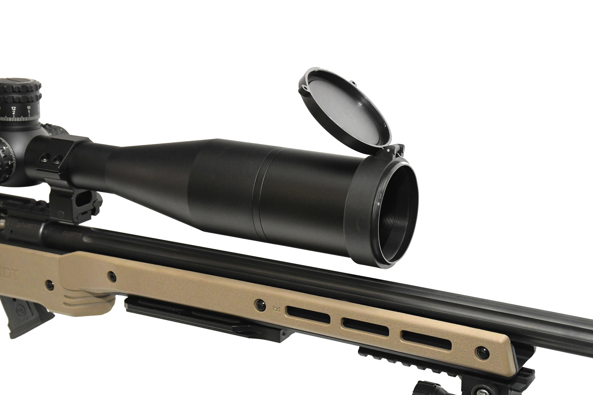 The Keck Optics Precision 34 5-30x56 FFP IR riflescope mounted on a rifle on a tripod.
