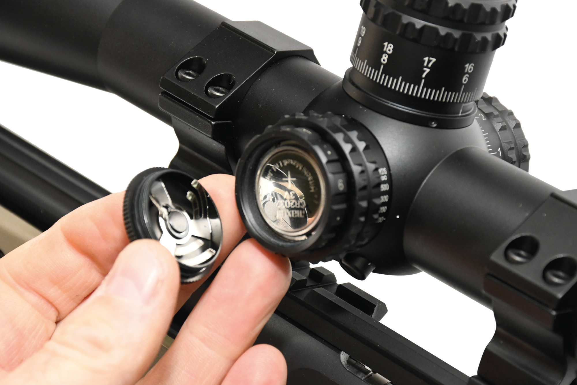 Illumination control is located at the outer edge of the parallax collar and offers six levels of reticle brightness. Only the very centre of the reticle illuminates red, with intermediate settings acting as off positions. There is no auto shut-off, so be mindful not to leave it on. Power comes from a standard CR2032 battery housed under a capped dial, accessible with a coin or the plastic tool that comes with the scope.