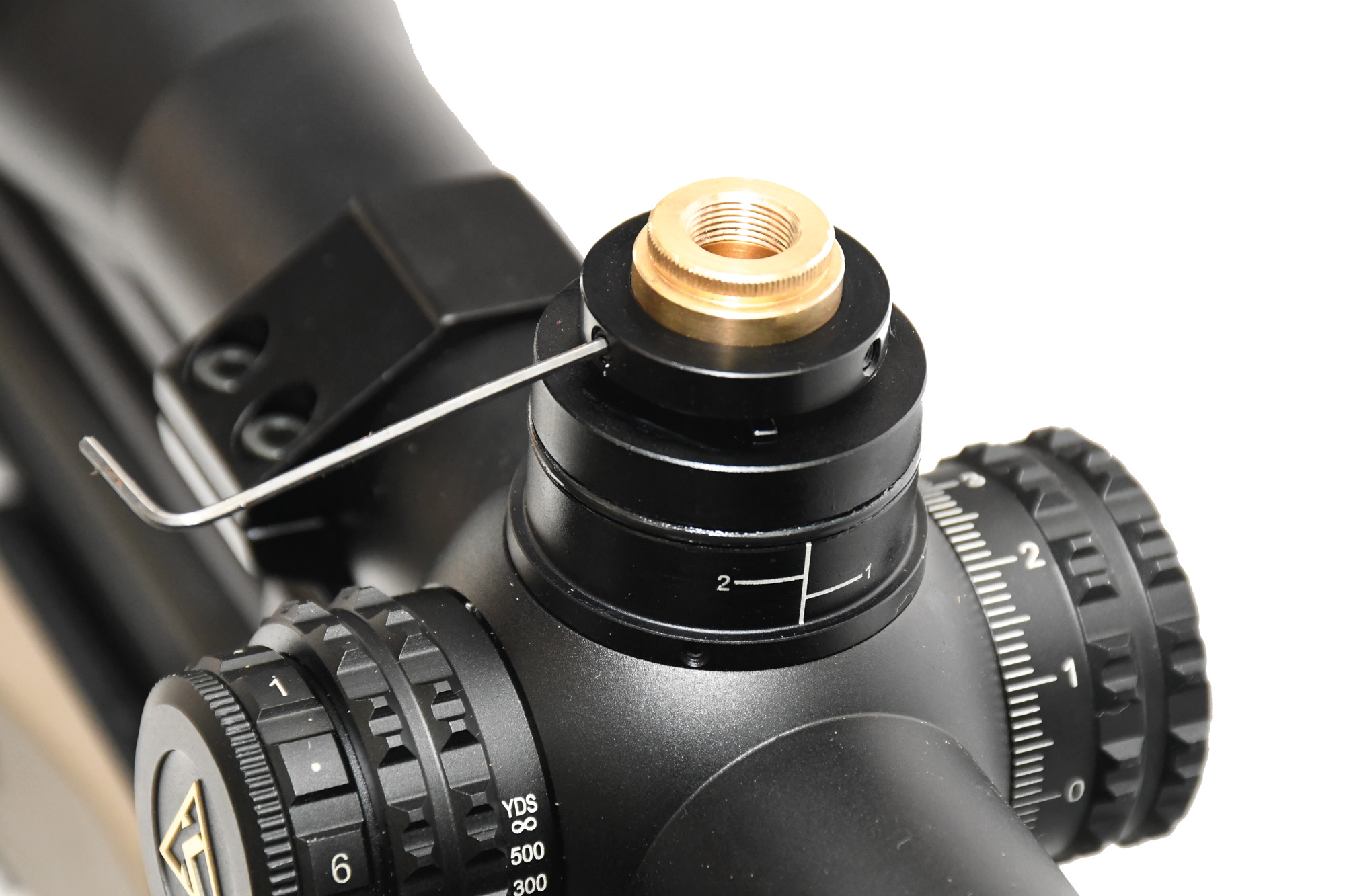 Both turrets feature a coin-slot dial cap for floating the dial when zeroing. The elevation turret’s zero stop is set via a small Allen key and three grub screws that lock it in position.