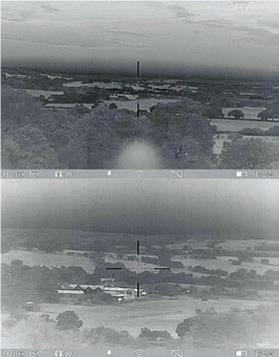 Regarding magnification, typical thermal devices feature a fixed optical magnification (a.k.a. ‘base mag’), of about 3x or lower, supplemented by a firmwaregenerated ‘digital zoom’ that enlarges the centre of the image, usually by 4-5x. This makes the base mag detail easier to see, but – unlike an optical zoom - doesn’t add any detail to the image. As such, its value is greatest in thermal riflescopes, where it permits more precise aiming, but even here, gains can be quickly compromised by pixelation.