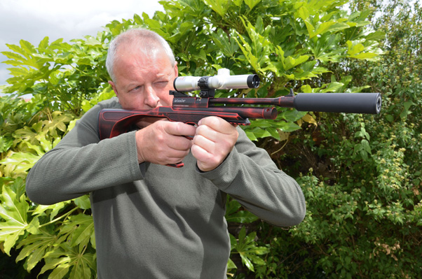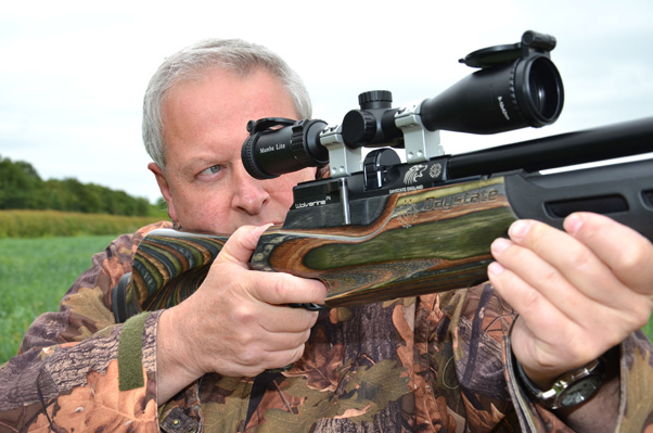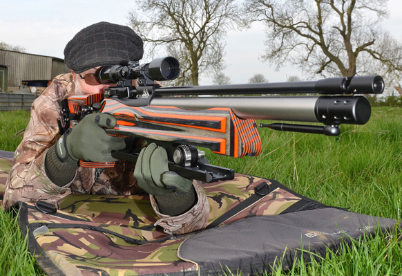 The rather attractive Wolverine R, B-Type, seen here in green laminate, is purely mechanical, rather than electronic. A fully shrouded Lothar Walther barrel sits up front, and this gets a threaded muzzle to take a silencer. There’s a manual safety catch at the rear of the receiver, a match-style trigger with a fully adjustable mechanism and match blade, twin manometers safely positioned on the left side of the action, a Foster-style charging valve, the latest magazine system, and a subtle side-lever. This PCP is regulated, uses a 500cc cylinder, and boasts 600 shots in .22.