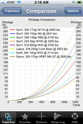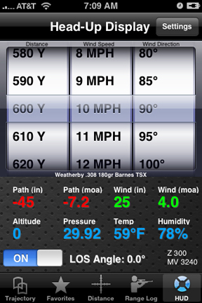 It only took a few minutes to download and install the software on my iPod. It was very intuitive to use and I was immediately impressed, which is quite rare for me! I’m not much of an instruction reader so I just tinkered and within minutes had data sets installed in it for three of my rifles. The output generated agreed exactly with previously verified results and over the course of the next few days I continued to tinker with the numerous extra features.