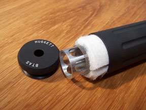 One end is machined for the industry standard ½” UNF thread, and the other is engraved with ‘Huggett’ and ‘BTAS’. Once the exit end cap is removed, the internals can be seen, which consist of two washers dividing the interior into three chambers. Sound absorbing wadding is wrapped around ventilated machined alloy tubes, and a very clever feature is the incorporation of the stainless steel mesh mentioned before, this stops the wadding being damaged by the air blast as it travels through the moderator. It also looks very good, being visible through the slots mentioned earlier.
