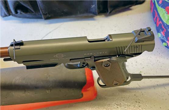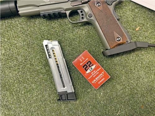 Edgars also import Hornady ammunition and supplied some of their Varmint Express, 40-grain round nose .22 Long Rifle ammo, quoted at 1070 FPS. Reliability with any semiauto is paramount, and to test this I added some Remington sub-sonics, MagTech round-nosed lead and some of Winchester’s 42-grain MAX sub. To its credit, the 1911 ate it all, without a single stoppage. In the end, I reckon I put about 400-rounds down range without any issues.