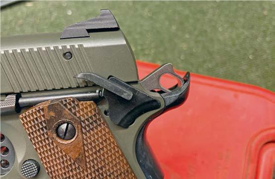 A stand-out feature of any 1911 is the grip safety. This shaped plate sits at the rear of the grip frame and is designed to press in as the firing grip is made. For this to function, you have to make the proper hold and in doing so, it frees the trigger to operate. The rear section is upswept to protect the web of the hand from possible hammer strike.