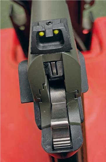 The magazine holds 10-rounds and inserts into the base of the grip, where it’s retained by a transverse button (mag catch) positioned at the rear of the trigger guard, on the left. It’s the ideal position for a right-handed shooter, as it sits near under the thumb and you can retain full control of the pistol as you eject it. After the last round has fired, the action locks open, ready for the reload. Here, you slap the full mag in and press down on the slide release with your thumb, and then you’re back in action.