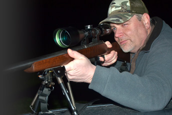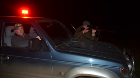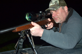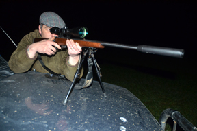 We drive on a few yards and a pair of long ears appears in the grass, quickly followed by the sharp crack of the 17 as Mark takes his first crop destroyer of the evening. Rob drives slowly with the truck on tick-over as he scans the fields for sign of our quarry, there is a BANG BANG on the roof from Mark telling us that he has spotted something we have missed, so we stop, reversing the sweep of the lamp until a pair of telltale eyes fill the beam. The routine of this experienced team continues like this for the next three hours, Mark shooting from inside the truck, the roof and even across the bonnet to get an extra bit of stability for the longer shots.
