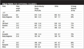 I used a variety of guns to reflect a true velocity and energy figure that you may encounter. Temperature on the day will makes a difference from the same rifle too. Each calibre has its own merits. The .177, .20 and .22 retain good velocity levels out to 30 yards and what the .25 started with it retained well, but 20-25 yard is the limit in my view.