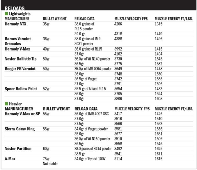 The best light bullets have to be in the 40-grain range; here good velocities coupled to flat trajectories are dynamite on distant crows. Best all-rounder here has to be the Hornady V-MAX, with a max load of 37-grains of RL15 will achieve 4102 fps/1494 ft/lbs from a 24” barrel.
